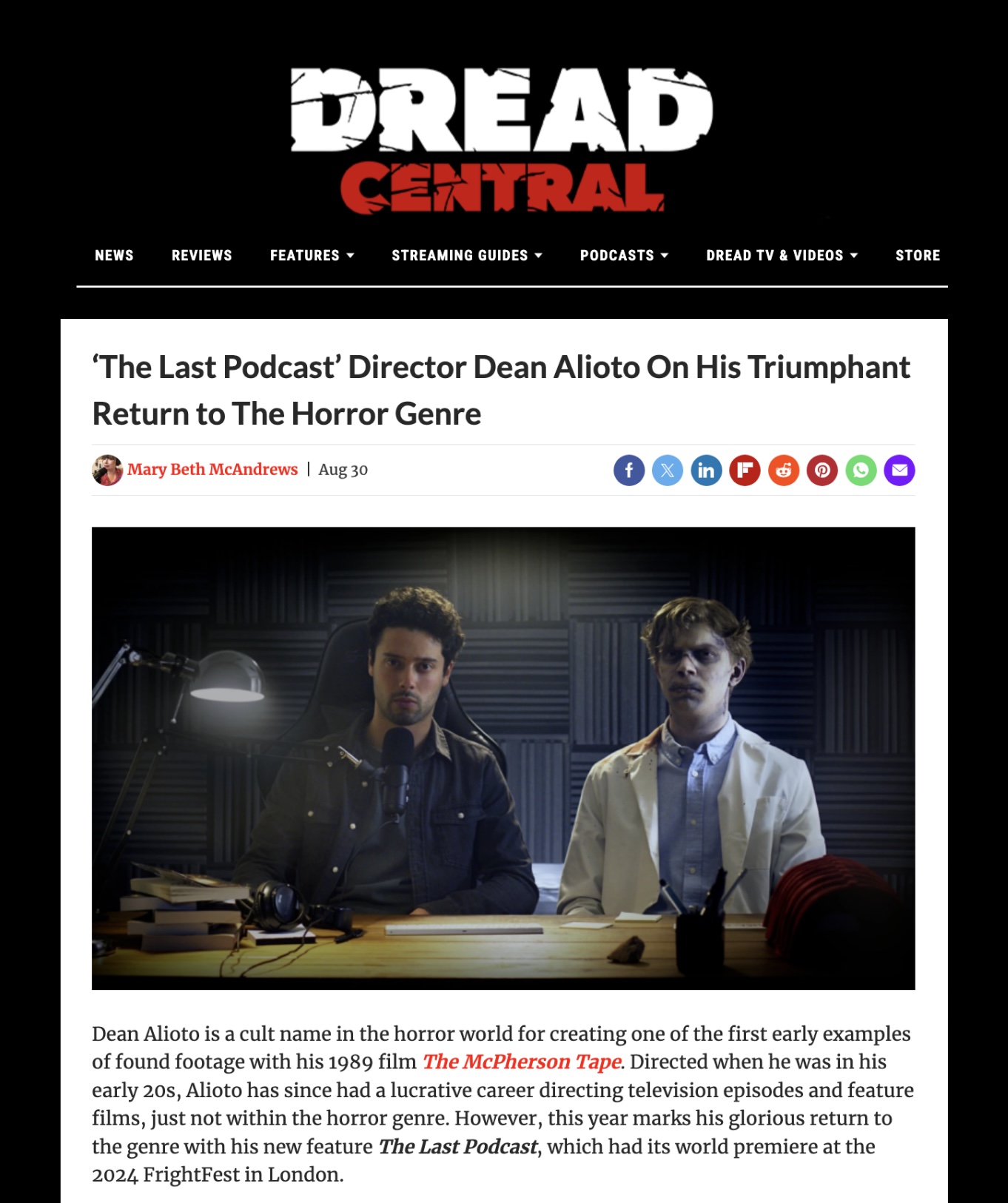 Filmmaker Dean Alioto got his start dropping out of two film schools to work on movies for Steven Spielberg, Clint Eastwood, and Oliver Stone. Dean went on to direct documentaries and independent films, including the supernatural thriller Portal for Vertical Entertainment. His abilities as an innovative storyteller have been singled out by Collider and Dread Central and he was featured in the Paramount + Documentary Unknown Dimensions as the creator of the first ever found footage movie The McPherson Tape. Recently, Dean has released the two-part UFO documentary series The Alien Perspective for Amazon and has finished his successful film festival run for the upcoming horror-comedy The Last Podcast. Currently, Dean is in development on a show for Blumhouse TV.